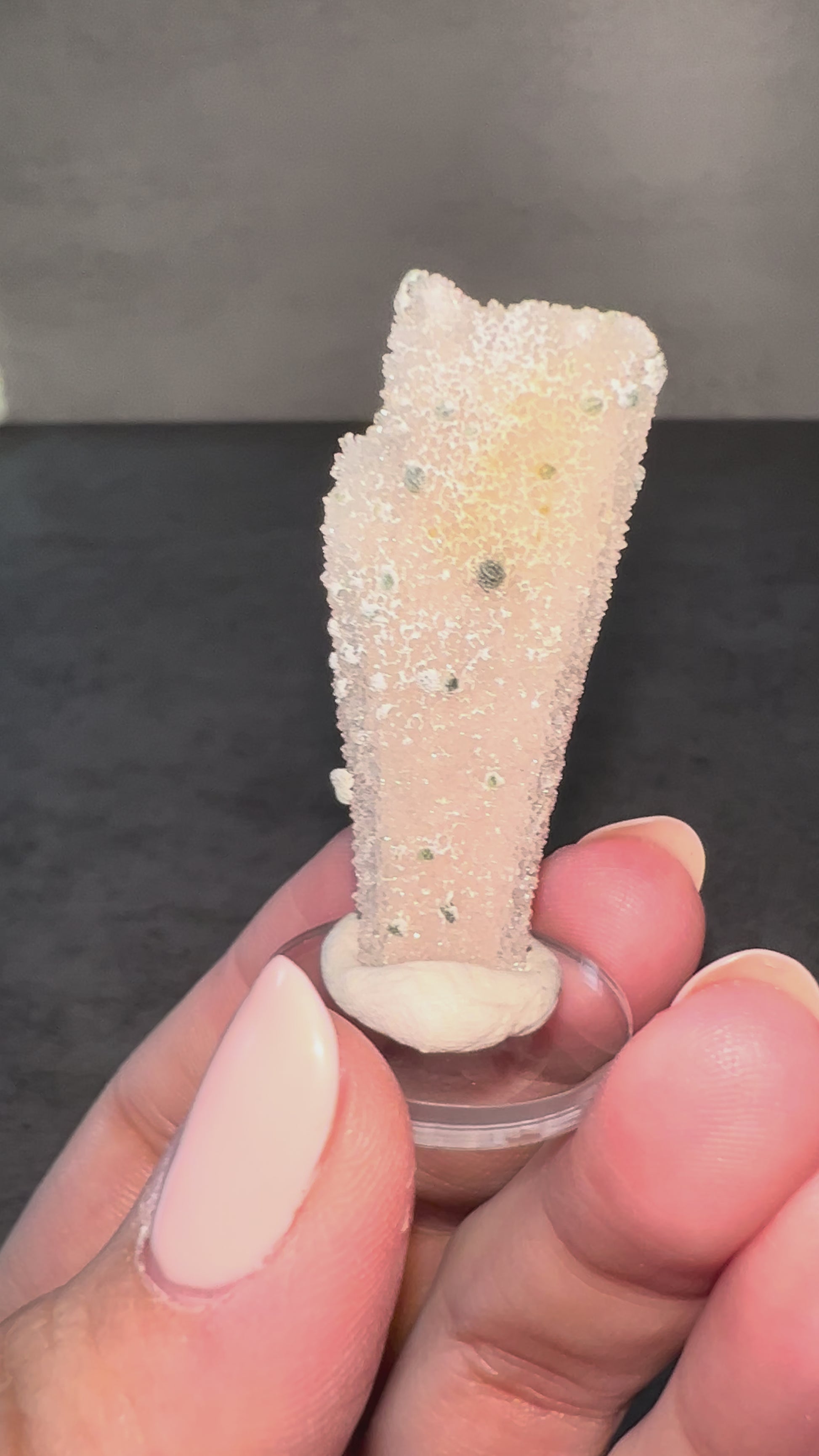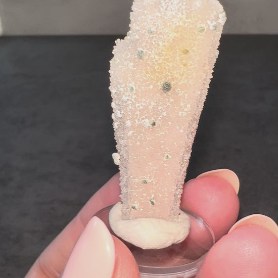 This specimen showcases a uniquely frosted crystalline surface. Scattered throughout the structure are natural green inclusions, adding a striking contrast against the soft, blush body of the mineral.