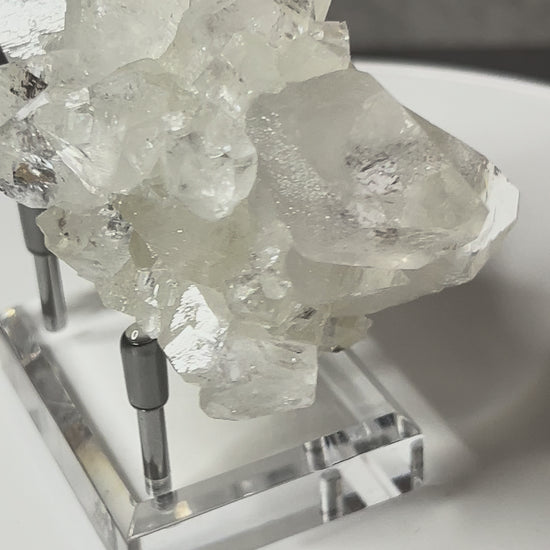 This radiant cluster of apophyllite shines like glass. Known for its uplifting, high vibrational energy, apophyllite is known to enhance clarity, intuition, and spiritual connection.