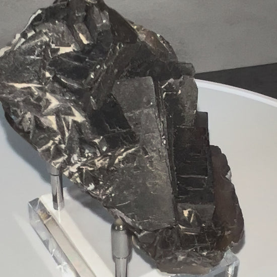 This rare black fluorite cluster features bold, geometric crystal formations with a deep, inky black luster and hints of smoky translucence. Unlike more common purple or green fluorite, the black variety carries a striking intensity, making it both visually dramatic and energetically grounding.