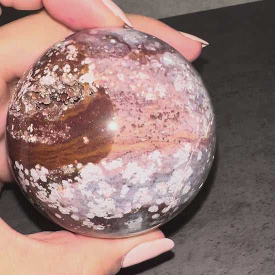 This cosmic jasper sphere is a captivating blend of grounding earth energy and celestial beauty. Its deep chocolate brown tones are beautifully contrasted with soft white and lilac speckles, creating a planetary like surface that resembles distant cosmic landscapes.