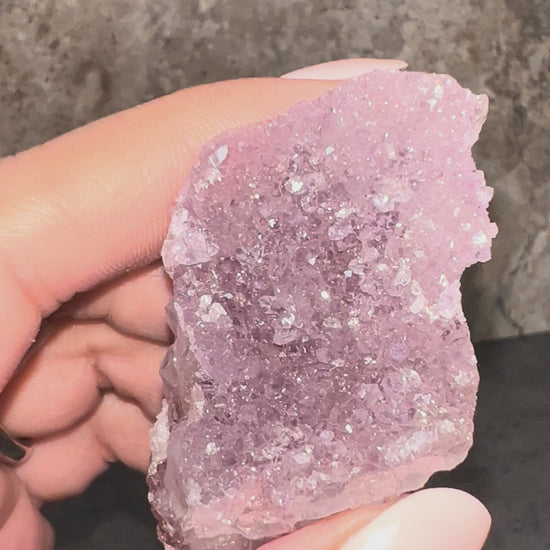 This rainbow amethyst glows with soft pastel purple tones, its sparkling druzy surface shimmering with subtle rainbow flashes.