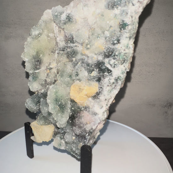 This beautiful flower Amethyst displays delicate, flower crystal formations sprinkled with sparkling druzy quartz. Soft shades of lavender, green, and chunks of calcite across the surface create a dream scene.