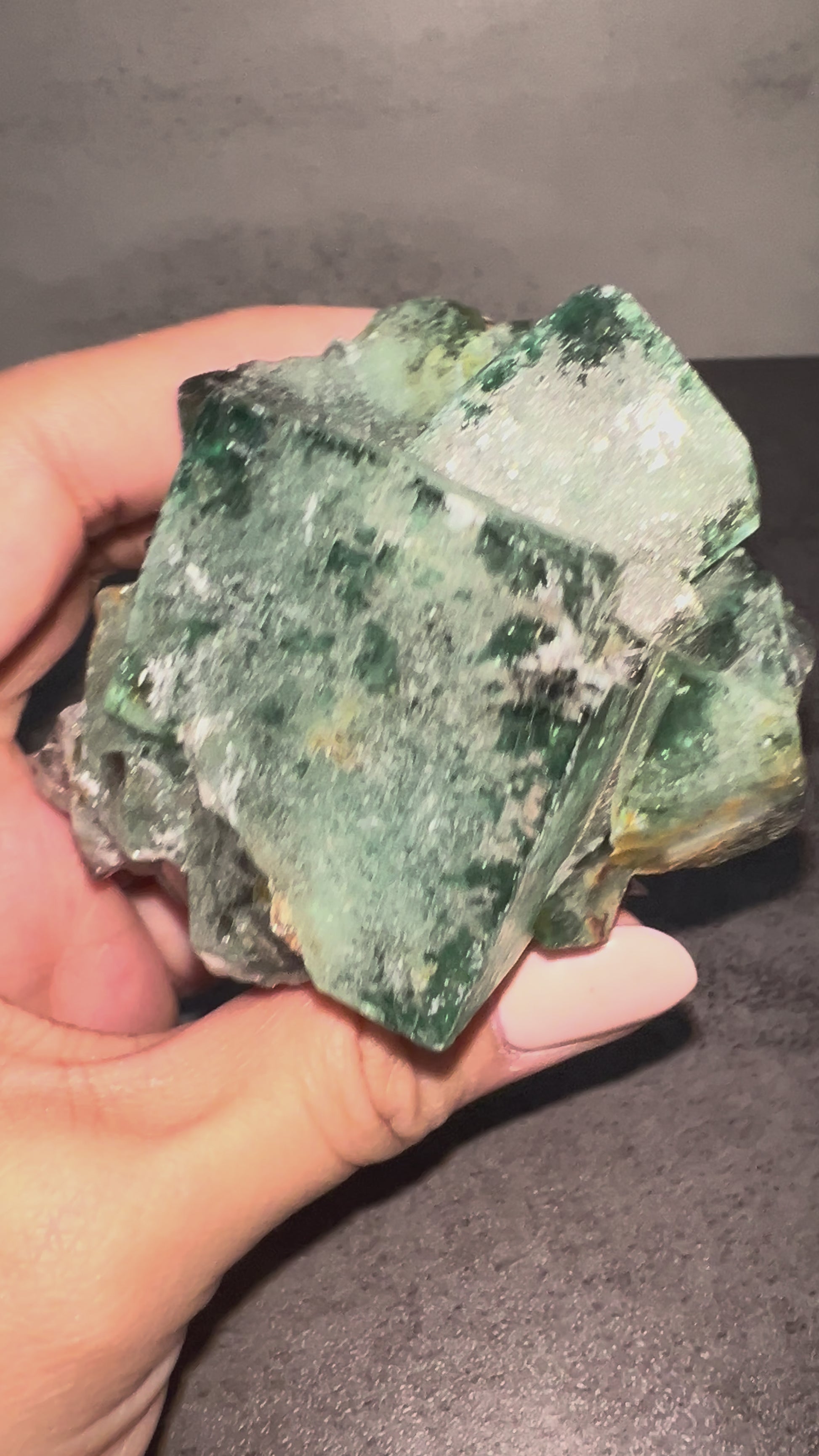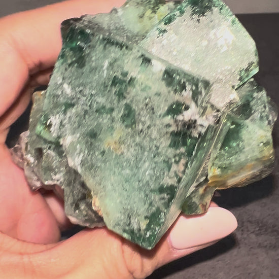 This green fluorite cluster showcases striking, translucent shades of emerald and mossy green, with natural cubic formations that shimmer under the light. Its surfaces capture the raw beauty of this mineral while reflecting a soft, luminous glow.
