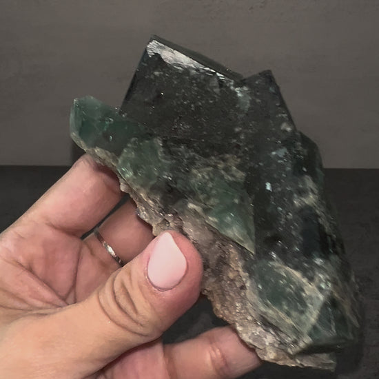This striking specimen of green fluorite displays sharp cubic formations with a deep emerald-to-teal glow, beautifully accented by its natural matrix covered in calcite cubes. The crystal faces reveal a glassy luster with subtle zoning and inner clarity, showcasing the classic character that makes fluorite so highly collectible. Perfect as a display specimen, it captures the balance between crystalline brilliance and natural grounding.