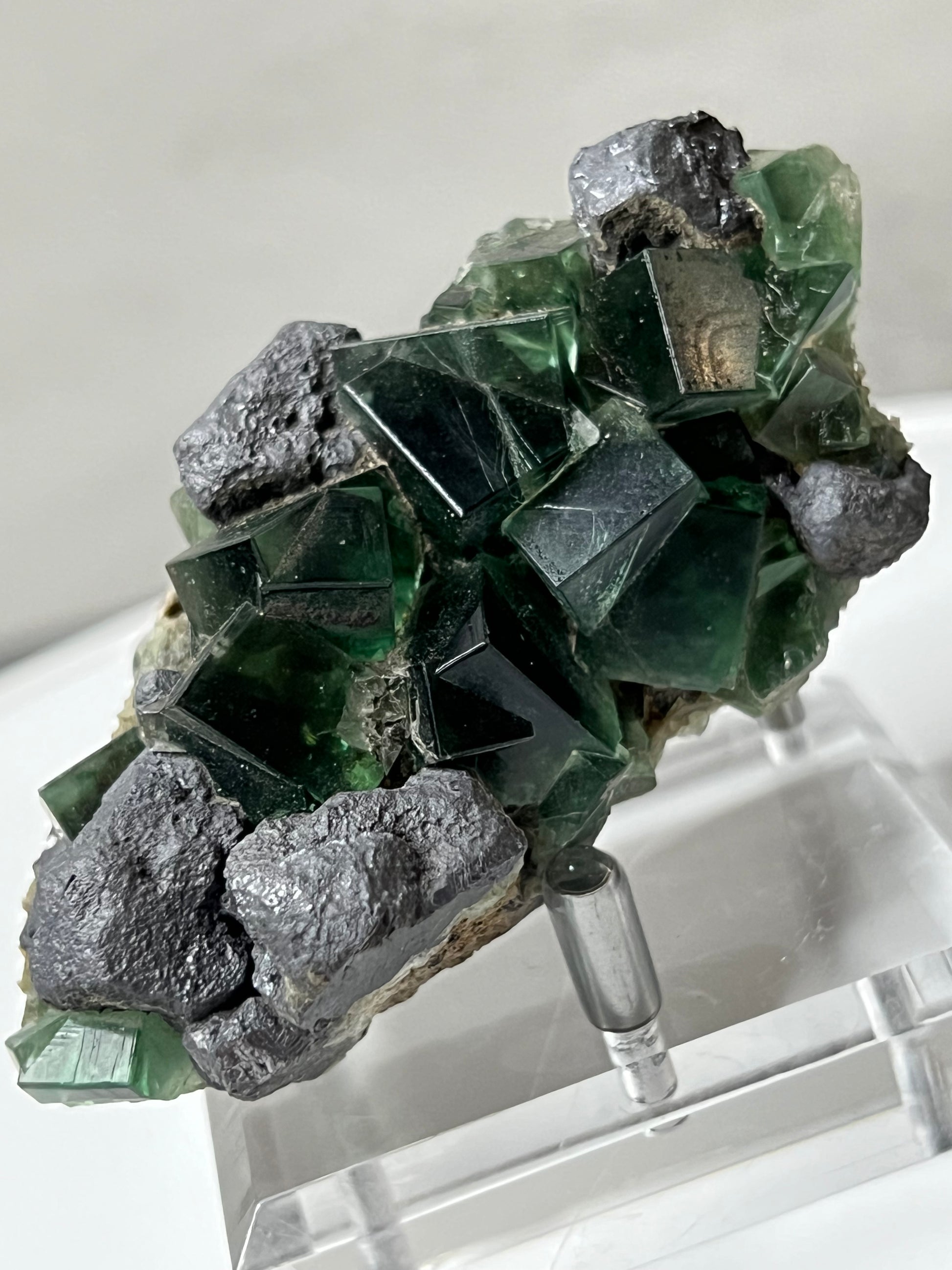 This fluorite specimen features rich green fluorite crystals with sharp cubic formations, beautifully accented by galena. The fluorite’s deep emerald tones glow with translucence.