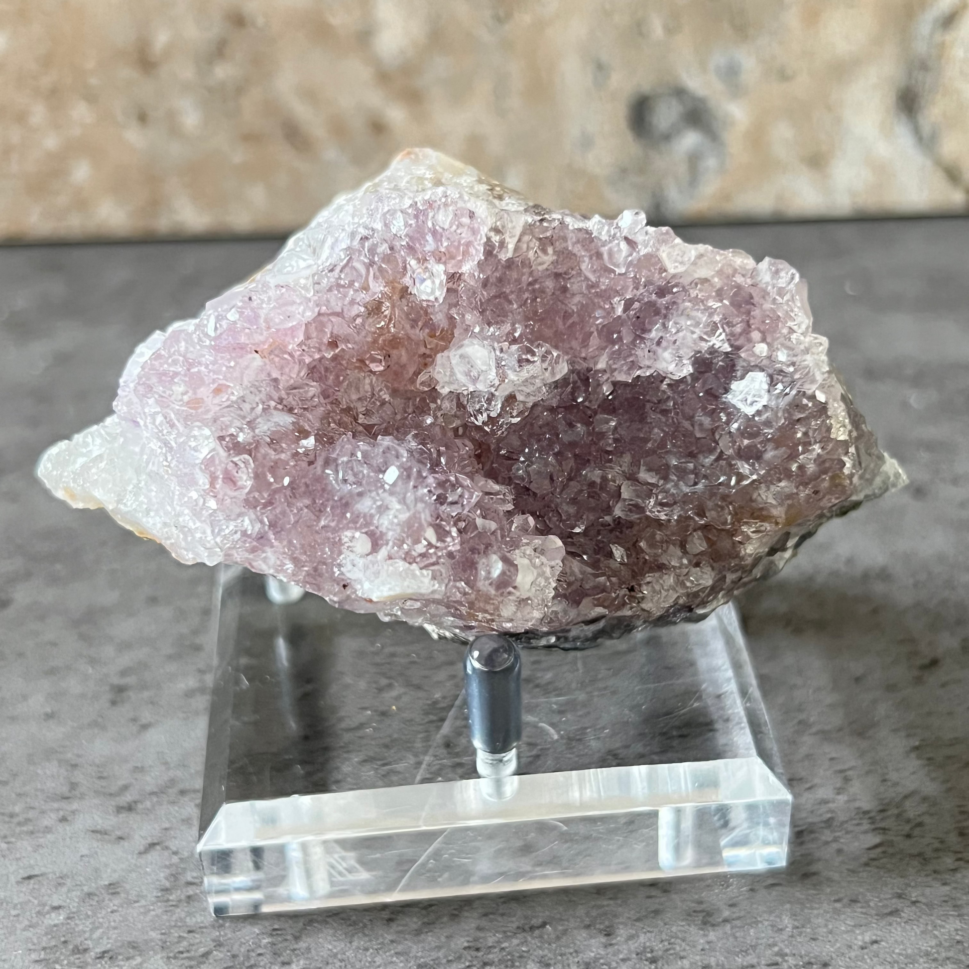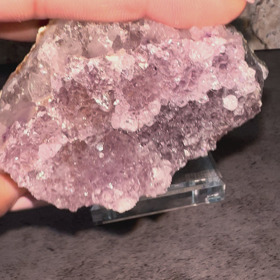 This lavender rainbow amethyst glows with soft pastel tones, where gentle lavender crystals shimmer with iridescent rainbow flashes that dance in the light. Its fine druzy surface adds a touch of sparkle and depth, creating an enchanting display that feels both soothing and ethereal. With its airy, uplifting presence, this piece embodies a dreamy elegance that invites calm, beauty, and serenity into any space.