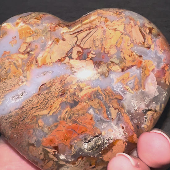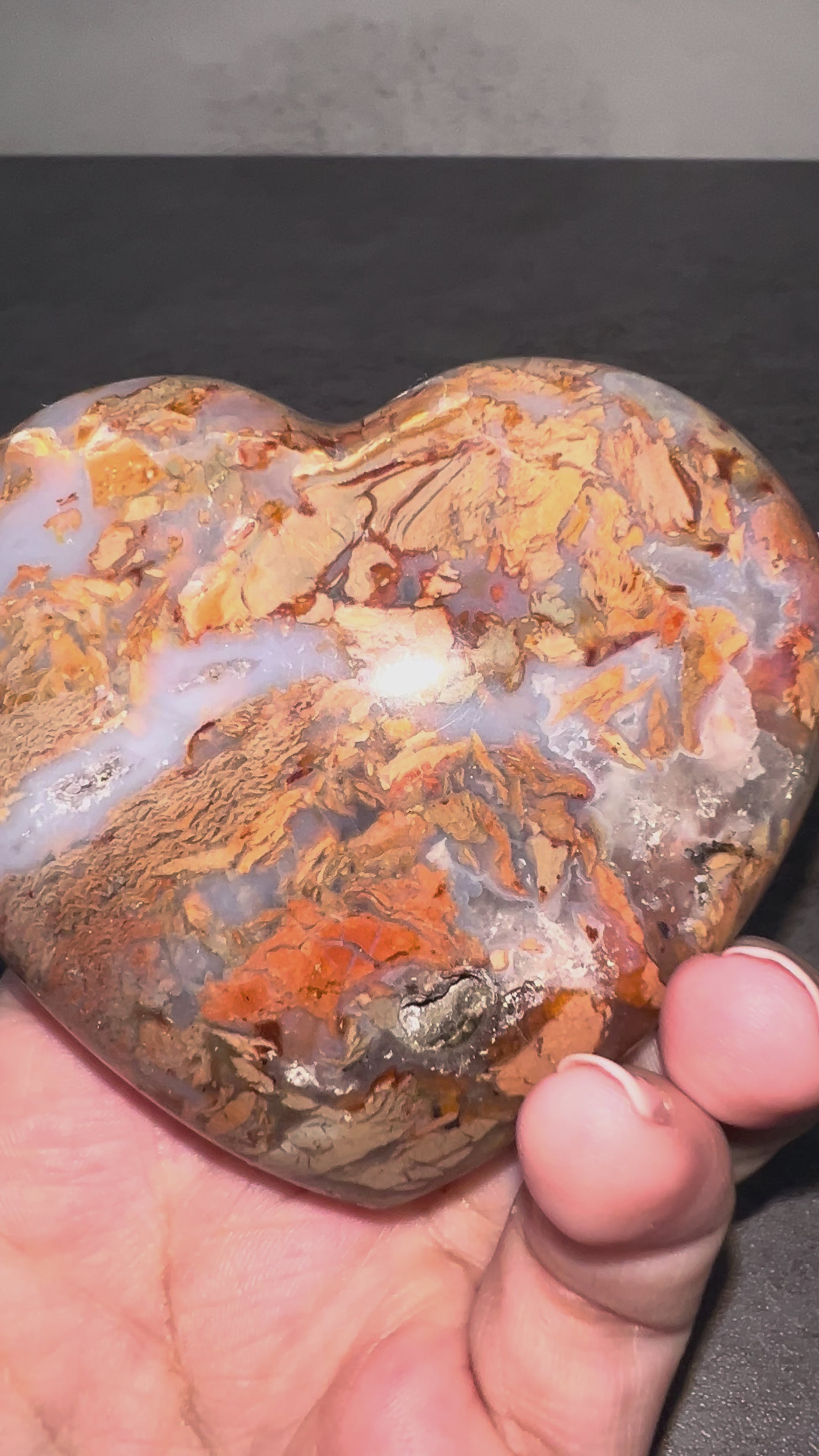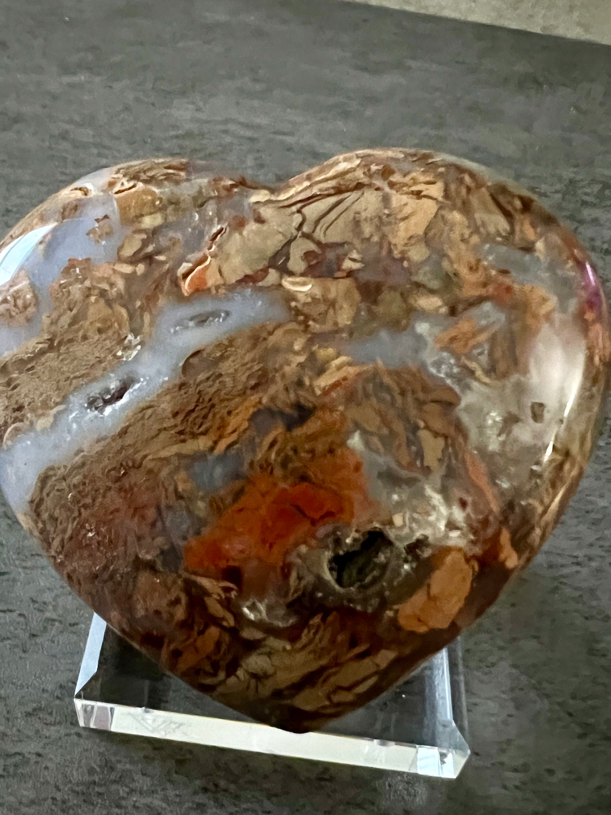 This beautifully polished ibis jasper heart displays earthy swirls of brown, cream, and burnt orange with natural patterns that resemble flowing landscapes. These patterns form when mineral inclusions compact under pressure, forming dense, durable jasper. The swirling, landscape like patterns of ibis jasper result from the way minerals layered and mixed as it solidified.