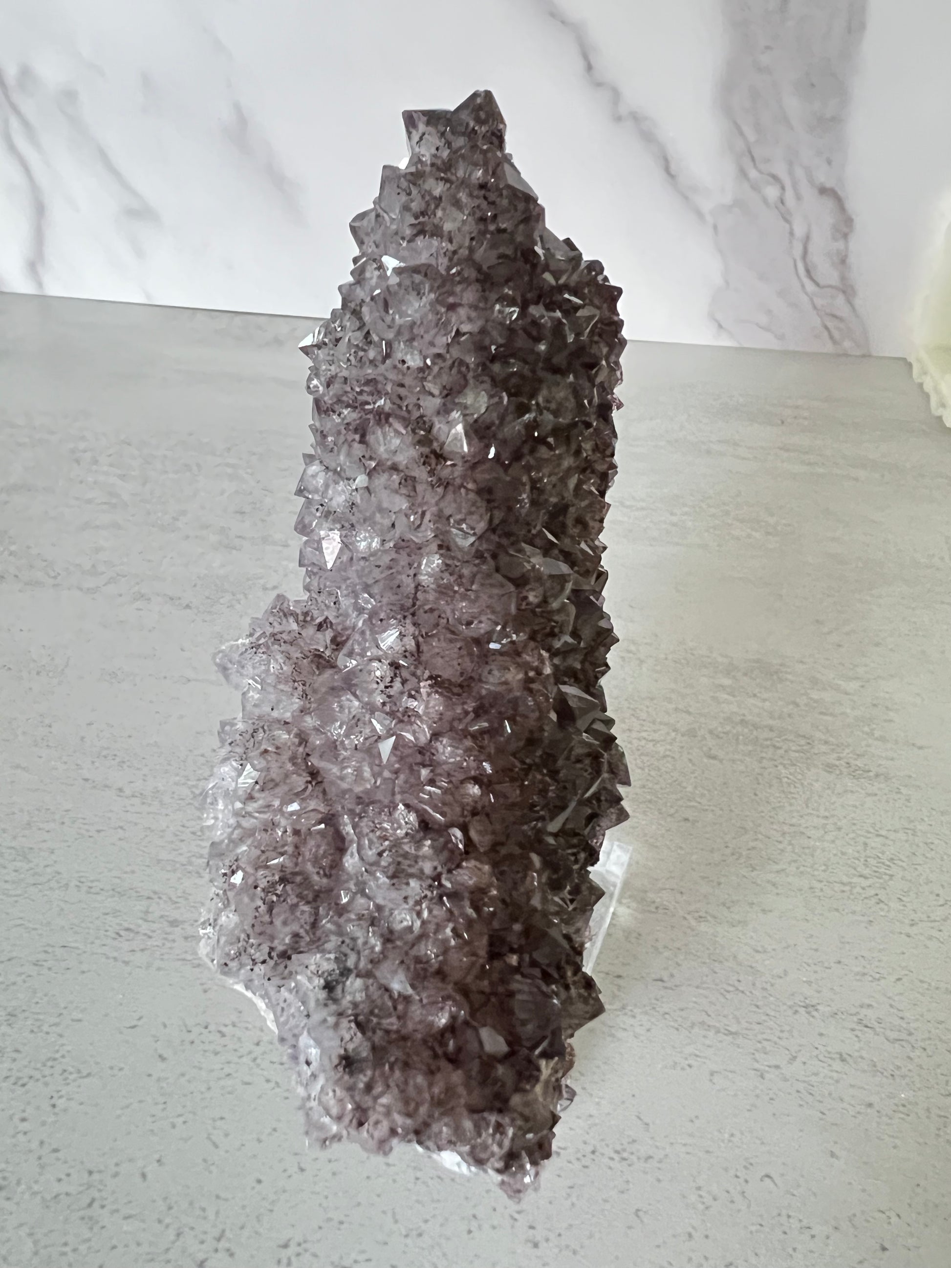 This piece is 97% covered in amethyst crystals. One side is lilac with goethite and then transitions into a pale lilac. It can be displayed and oriented in many ways.