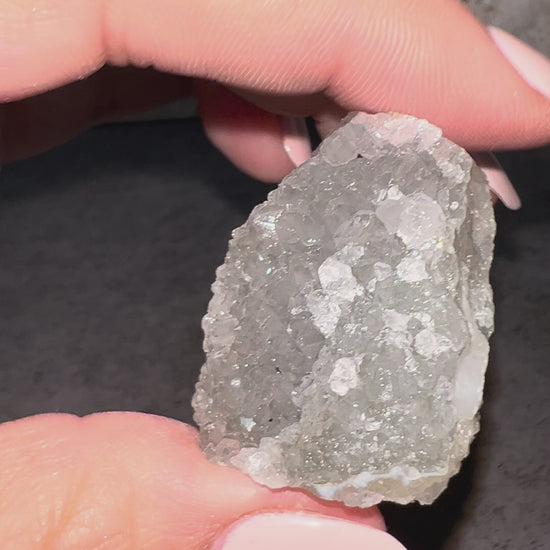 This pale green amethyst glistens with a soft, translucent green hue, illuminated by delicate rainbow flashes that sparkle across its druzy surface. Its refreshing, serene tones offer a calming twist on the classic amethyst, while the pale green coloration evokes an airy, soothing elegance.