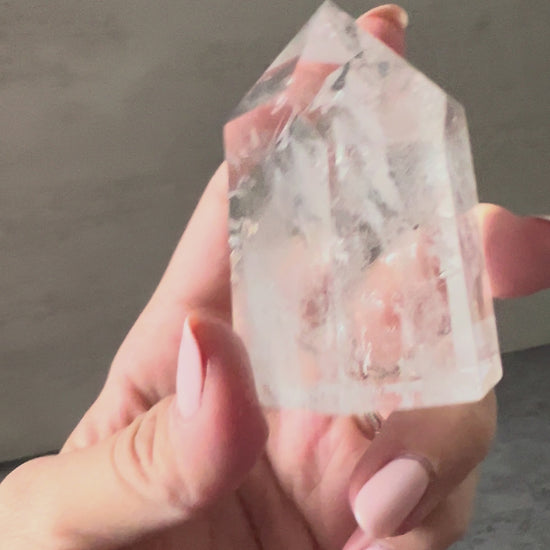 This Clear Quartz tower with a small inclusion features a polished point that highlights the stone’s natural clarity and light-reflecting beauty. Clear Quartz is often called the “Master Healer,” making this piece not only a striking display crystal but also a versatile addition to any collection or energy practice.