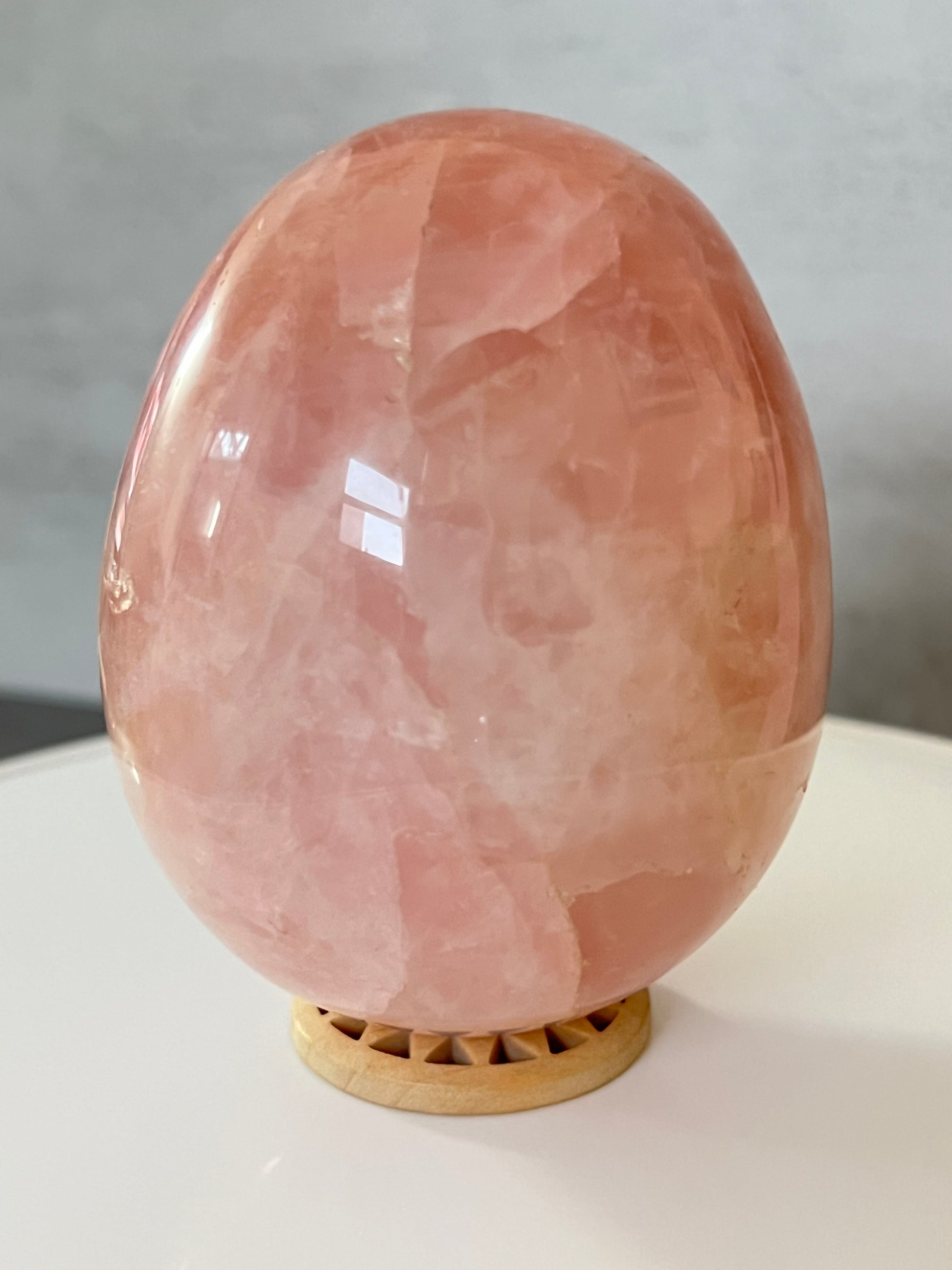 This rose quartz Egg glows with shades of blush pink. Its luminous surface reveals delicate natural marbling, creating a calming visual flow that embodies grace and tenderness.
