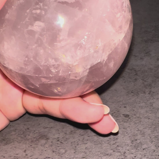 This radiant rose quartz sphere glows with soft shades of blush pink, its polished surface highlighting the natural beauty and gentle energy within. The soothing color makes it an elegant and inviting piece for display. Perfect as a centerpiece, a gift of love, or a treasured addition to any crystal collection.