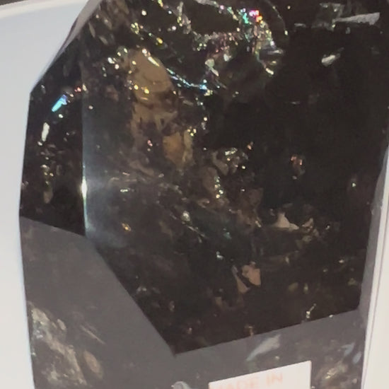 This nearly black smokey is semi-transparent with visible internal veils and fractures, which create reflective rainbows, giving it extra vibrancy.