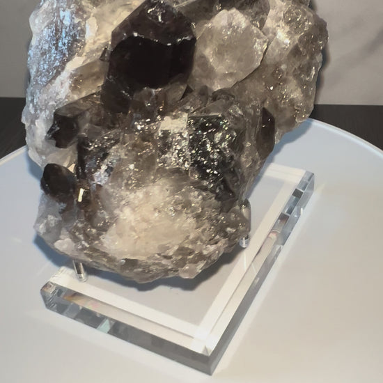 This stunning smokey quartz cluster captures the quiet strength of the earth through its silvery gray tones. Each crystal point rises sharply from the center, showcasing a mirror-like luster and natural striations that catch the light with a subtle metallic sheen.