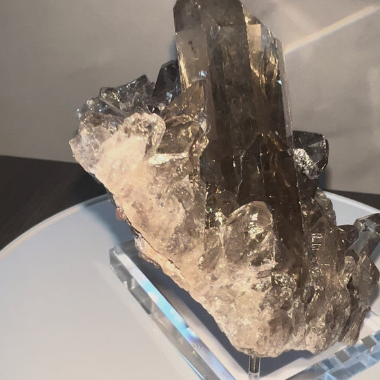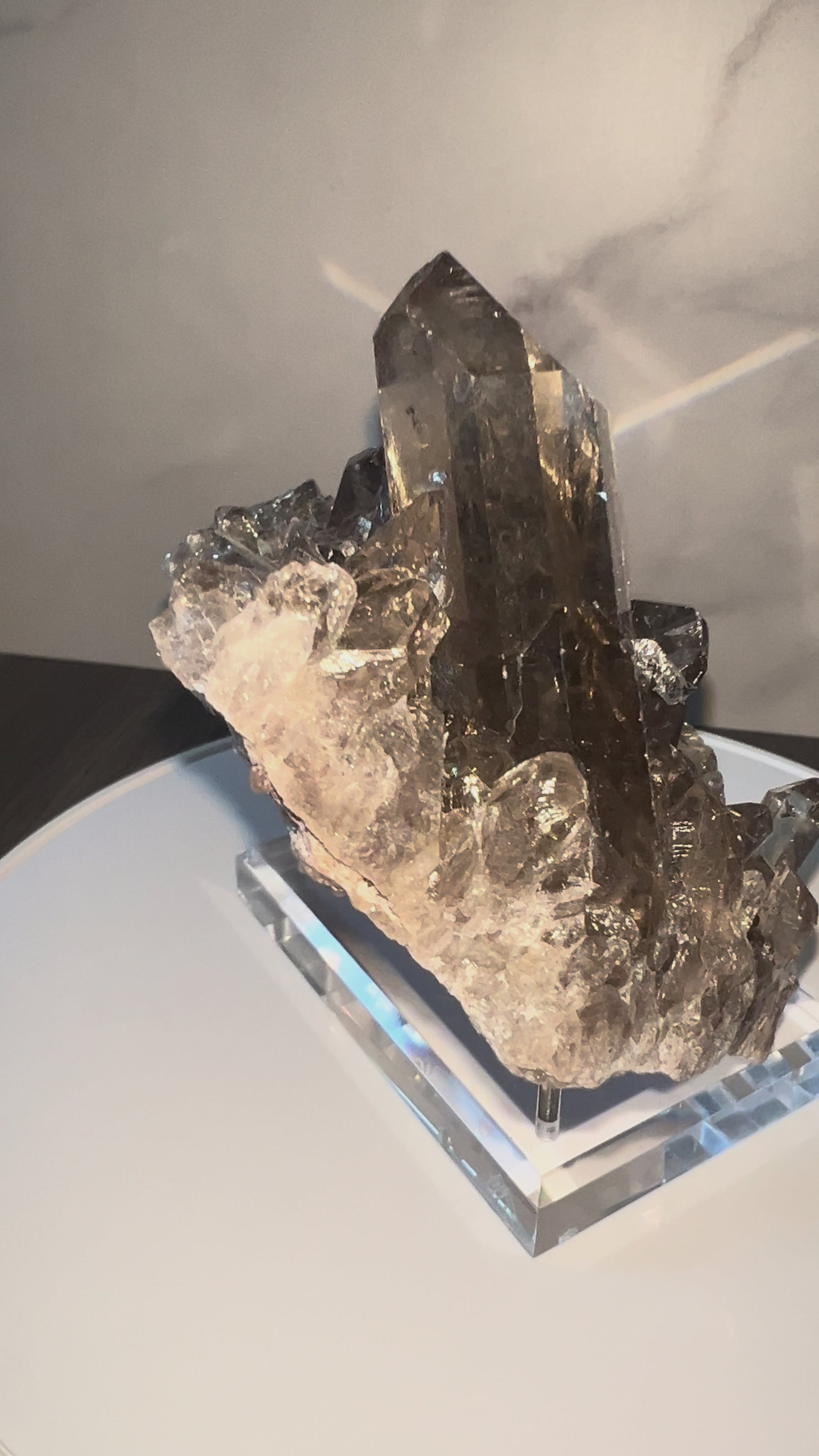 This smokey formation features an array of finely terminated points rising from a shared matrix, creating a captivating landscape of sparkle and depth. Its clarity reveals delicate inner veils that glow subtly under light, offering both visual and energetic harmony.