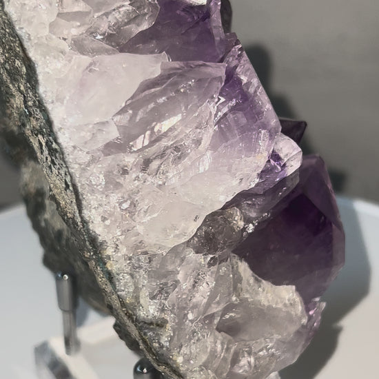 This amethyst cluster showcases chunky points that catch and reflect the light beautifully. A perfect choice for collectors, healers, or anyone drawn to the elegance and energy of amethyst.
