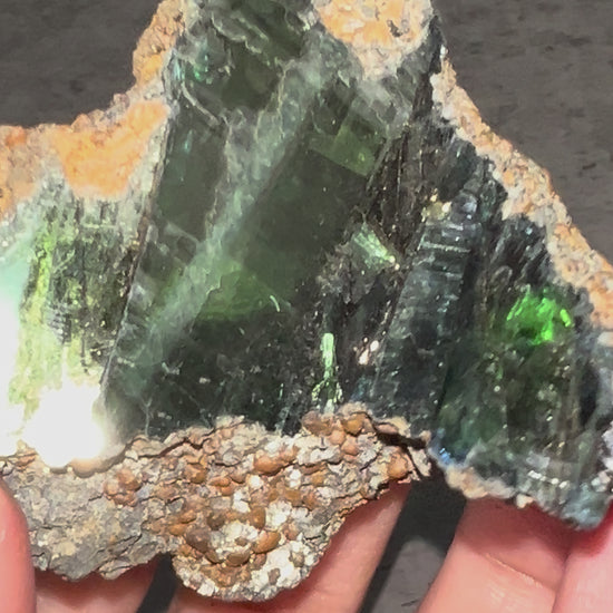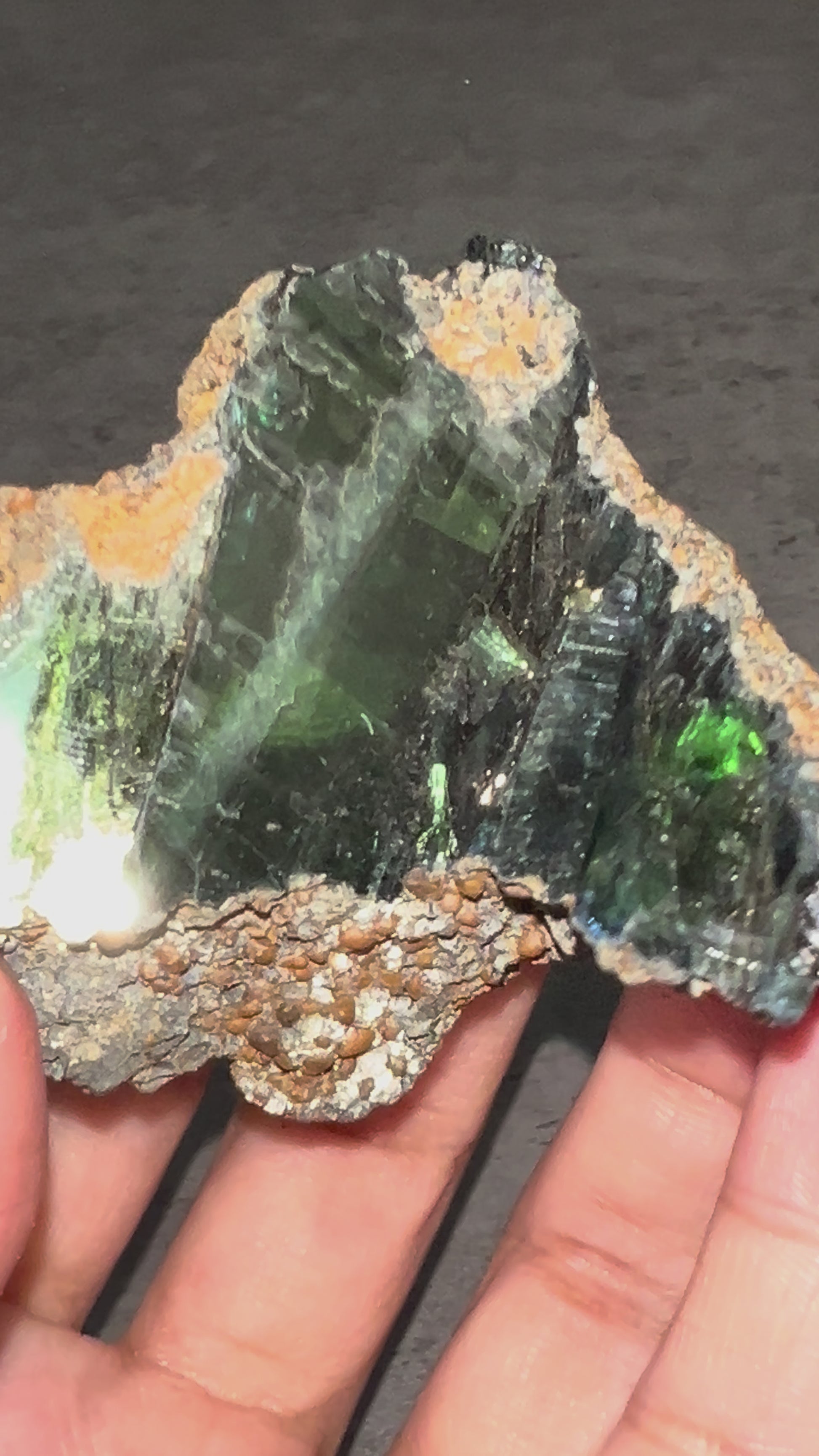 This striking vivianite specimen displays deep forest green crystal with a natural glassy luster, radiating an almost ethereal glow when caught in the light. The elongated crystal blades rise dramatically from the matrix, creating a breathtaking rich green transparency. Vivianite is very delicate and should be handle with care.